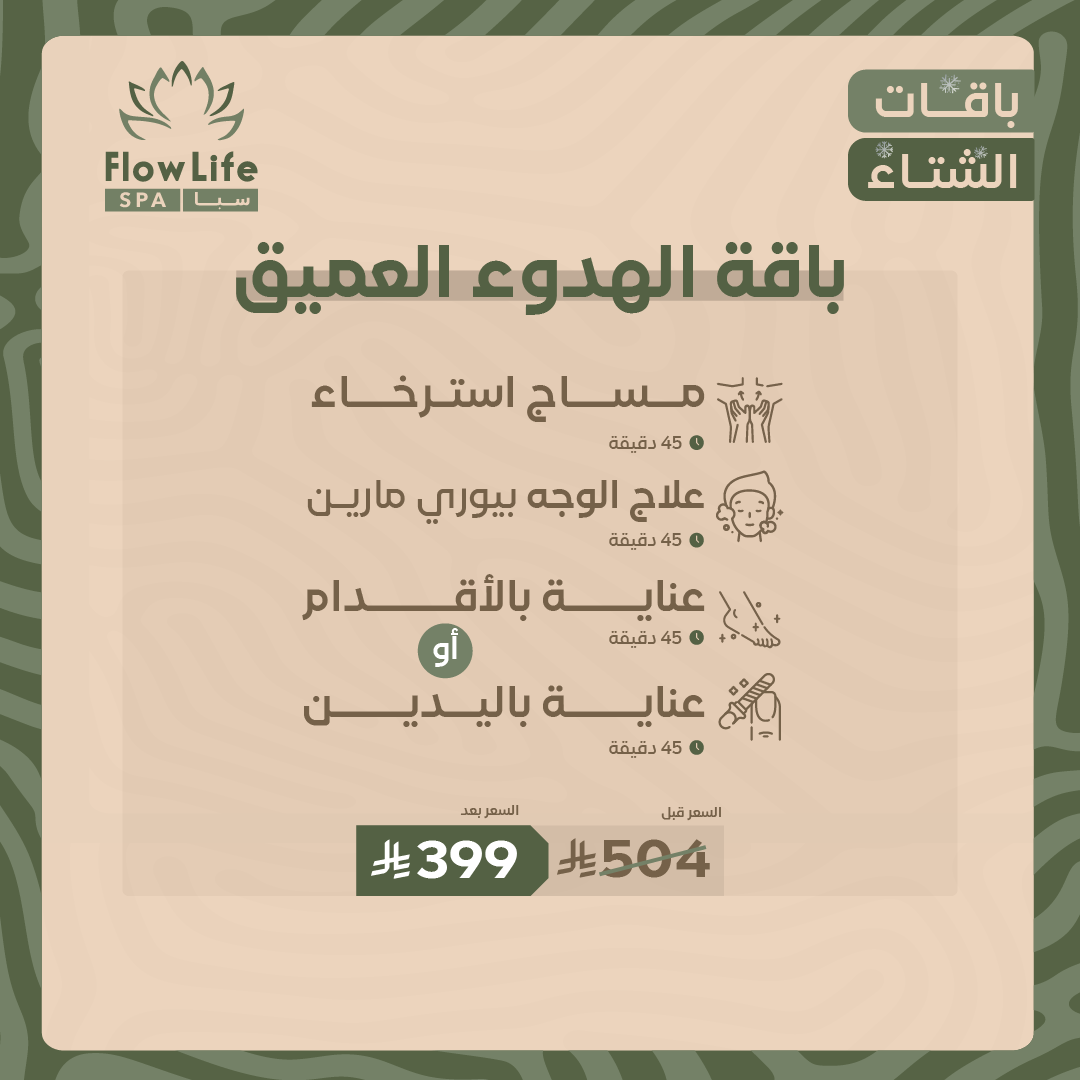 تبدأ الباقة بجلسة مساج استرخائي تساعد على إرخاء العضلات العميقة وتحسين الدورة الدموية، يليها علاج وجه بيوري مارينغ الذي يغذي البشرة ويمنحها نضارة صحية، ثم عناية متكاملة بالأقدام أو اليدين لتكتمل لحظة الاسترخاء والاهتمام بأدق التفاصيل.